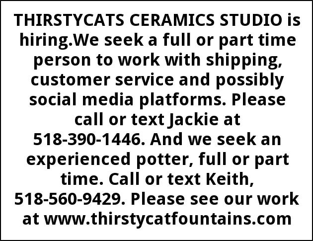 THIRSTYCATS CERAMICS STUDIO is hiring.We seek a full or part time person to work with shipping, customer service and possibly social media platforms. Please call or text Jackie at 518-390-1446. And we seek an experienced potter, full or part time. Call or text Keith, 518-560-9429. Please see our work at www.thirstycatfountains.com