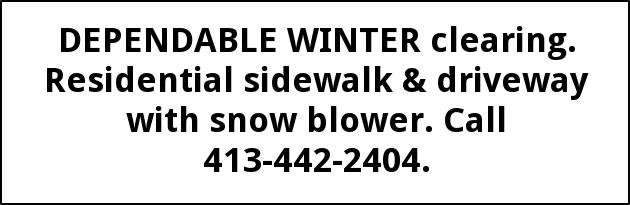 DEPENDABLE WINTER clearing. Residential sidewalk & driveway with snow blower. Call 413-442-2404.