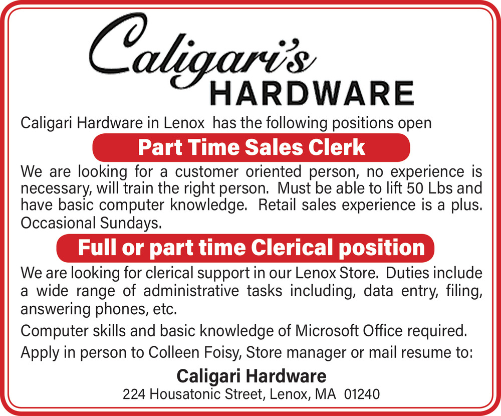 Oct 22, 2025. Caligari's Hardware Sales Clerk Jobs from The Berkshire Eagle