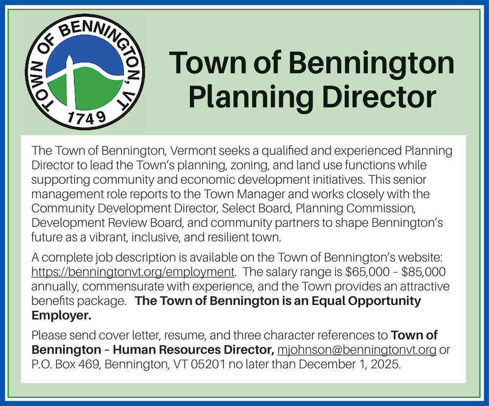 Nov 14, 2025. Town of Bennington Planning Director Jobs from The Manchester Journal