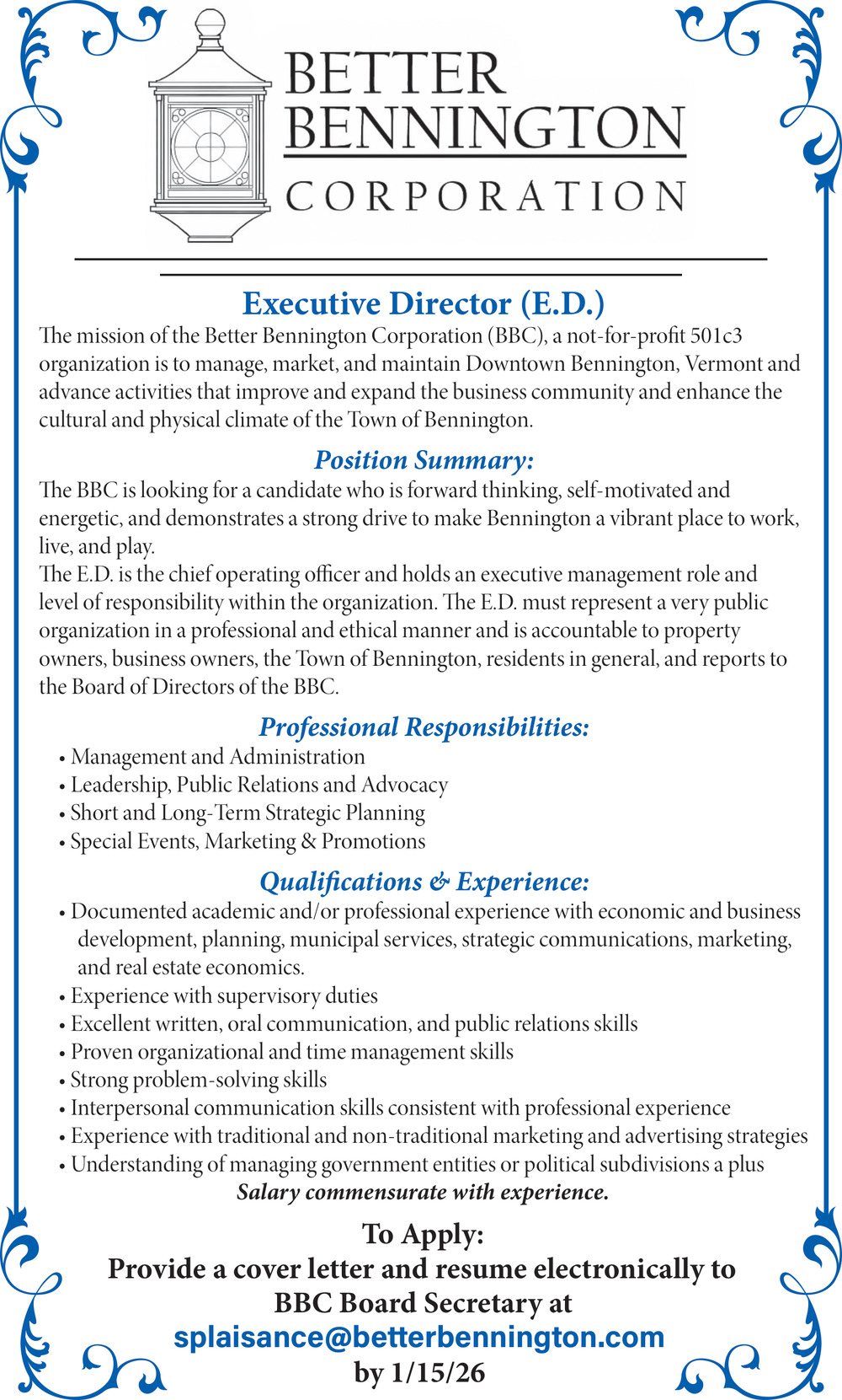 Dec 11, 2025. Better Bennington Corporation Executive Director Jobs from The Bennington Banner