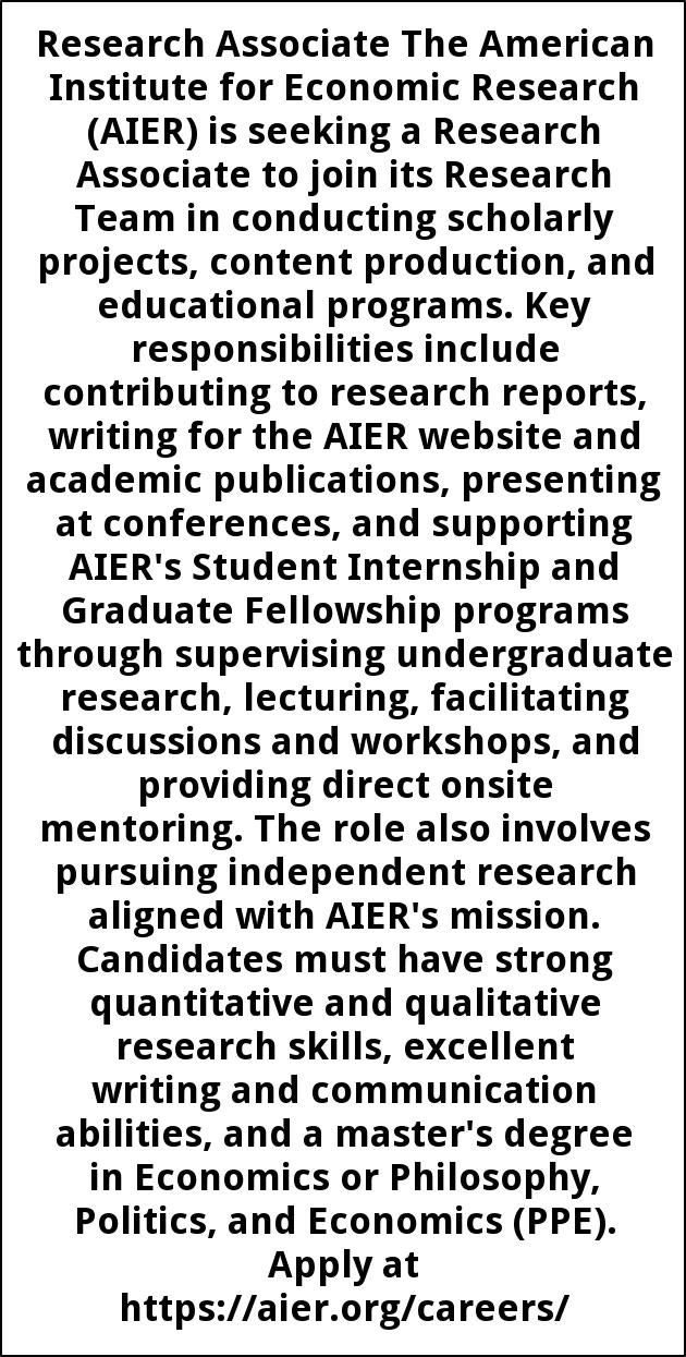 Research Associate The American Institute for Economic Research (AIER) is seeking a Research Associate to join its Research Team in conducting scholarly projects, content production, and educational programs. Key responsibilities include contributing to research reports, writing for the AIER website and academic publications, presenting at conferences, and supporting AIER's Student Internship and Graduate Fellowship programs through supervising undergraduate research, lecturing, facilitating discussions and workshops, and providing direct onsite mentoring. The role also involves pursuing independent research aligned with AIER's mission. Candidates must have strong quantitative and qualitative research skills, excellent writing and communication abilities, and a master's degree in Economics or Philosophy, Politics, and Economics (PPE). Apply at https://aier.org/careers/