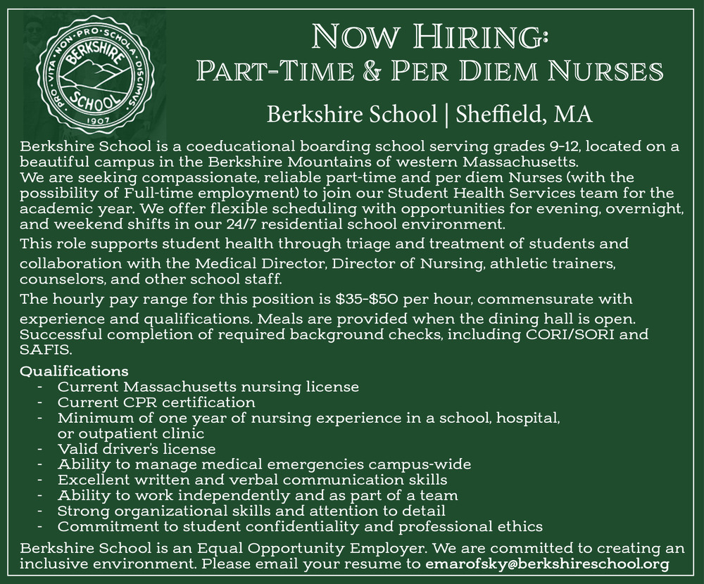 Jan 30, 2026. The Berkshire School, Inc. Nurses Jobs from The Berkshire Eagle