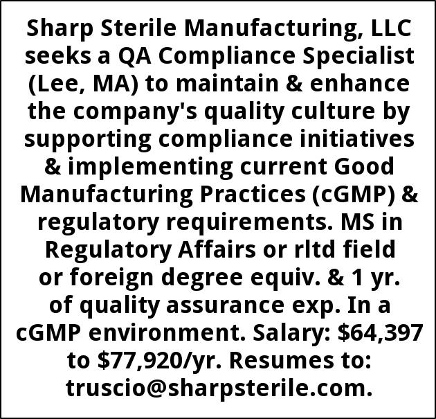 Sharp Sterile Manufacturing, LLC seeks a QA Compliance Specialist (Lee, MA) to maintain & enhance the company's quality culture by supporting compliance initiatives & implementing current Good Manufacturing Practices (cGMP) & regulatory requirements. MS in Regulatory Affairs or rltd field or foreign degree equiv. & 1 yr. of quality assurance exp. In a cGMP environment. Salary: $64,397 to $77,920/yr. Resumes to: truscio@sharpsterile.com.