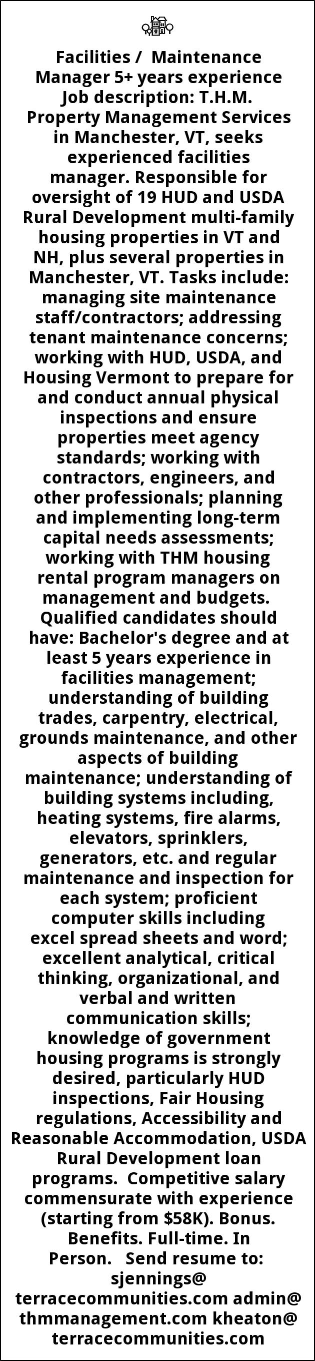 Facilities / Maintenance Manager 5+ years experience Job description: T.H.M. Property Management Services in Manchester, VT, seeks experienced facilities manager. Responsible for oversight of 19 HUD and USDA Rural Development multi-family housing properties in VT and NH, plus several properties in Manchester, VT. Tasks include: managing site maintenance staff/contractors; addressing tenant maintenance concerns; working with HUD, USDA, and Housing Vermont to prepare for and conduct annual physical inspections and ensure properties meet agency standards; working with contractors, engineers, and other professionals; planning and implementing long-term capital needs assessments; working with THM housing rental program managers on management and budgets. Qualified candidates should have: Bachelor's degree and at least 5 years experience in facilities management; understanding of building trades, carpentry, electrical, grounds maintenance, and other aspects of building maintenance; understanding of building systems including, heating systems, fire alarms, elevators, sprinklers, generators, etc. and regular maintenance and inspection for each system; proficient computer skills including excel spread sheets and word; excellent analytical, critical thinking, organizational, and verbal and written communication skills; knowledge of government housing programs is strongly desired, particularly HUD inspections, Fair Housing regulations, Accessibility and Reasonable Accommodation, USDA Rural Development loan programs. Competitive salary commensurate with experience (starting from $58K). Bonus. Benefits. Full-time. In Person. Send resume to: sjennings@ terracecommunities.com admin@ thmmanagement.com kheaton@ terracecommunities.com