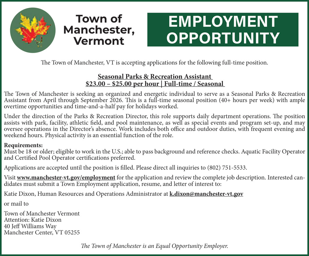 Feb 14, 2026. Town Of Manchester Recreation Assistant Jobs from The Bennington Banner