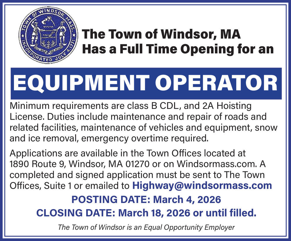 Mar 10, 2026. The Town of Windsor Equipment Operator Jobs from The Berkshire Eagle