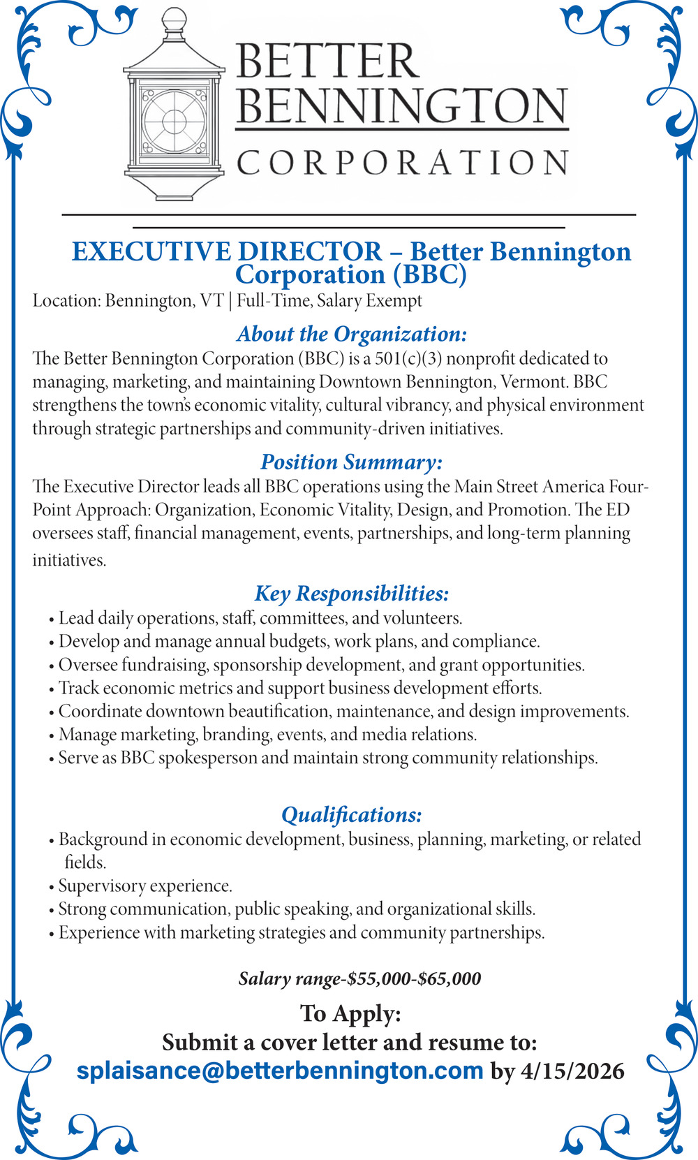 Mar 28, 2026. Better Bennington Corporation Executive Director Jobs from The Bennington Banner