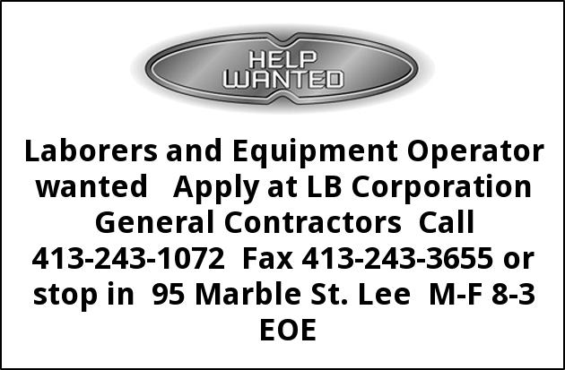 Laborers and Equipment Operator wanted Apply at LB Corporation General Contractors Call 413-243-1072 Fax 413-243-3655 or stop in 95 Marble St. Lee M-F 8-3 EOE