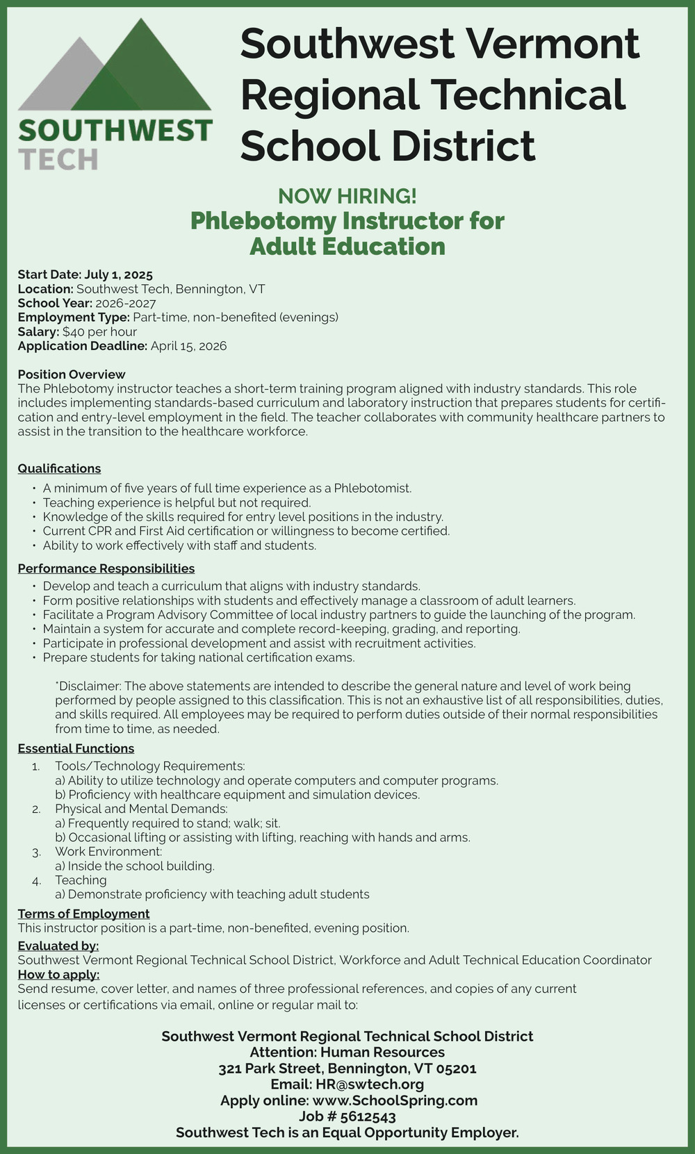 Apr 04, 2026. The Southwest Vermont School District Phlebotomy Instructor Jobs from The Bennington Banner
