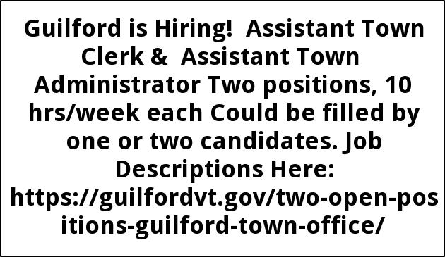 Guilford is Hiring! Assistant Town Clerk & Assistant Town Administrator Two positions, 10 hrs/week each Could be filled by one or two candidates. Job Descriptions Here: https://guilfordvt.gov/two-open-positions-guilford-town-office/