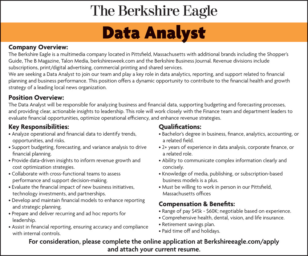 Apr 25, 2026. The Berkshire Eagle Data Analyst Jobs from The Berkshire Eagle